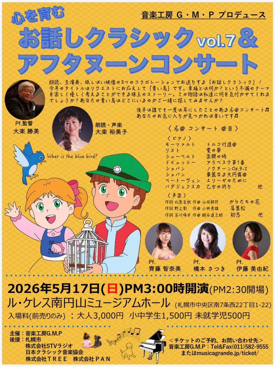 音楽工房G.M.P(ジーエムピー)は、札幌市南区真駒内柏丘でピアニストである大楽勝美(だいらくかつみ)とソプラノ歌手、ミュージックセラピストでもある大楽裕美子(だいらくゆみこ)が講師として、コンサート活動、コンサート主催、セミナー主催など、そしてマンツーマンとオンラインでピアノと声楽の音楽教室を運営しています。生徒様に素晴らしい音楽を奏でて欲しいという強い想いから「Great Music Performance」の頭文字をとって教室名を「音楽工房G.M.P」として、2002年10月に設立し、20年以上活動しております。これもひとえに、教室の生徒様や保護者の皆さまを始め、関係者様の方々のご理解、ご協力があったからこそと深く感謝しております。