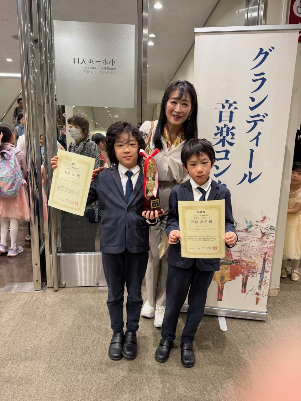 第6回グランディール音楽コンクール全国大会入賞おめでとう! 2026/04/14 第6回グランディール音楽コンクール全国大会入賞おめでとうございます! 兄弟で入賞です! 2026年3月30日、横浜関内ホールにおいて行われた第6回グランディール音楽コンクール全国大会において、小学3,4年生の部で、音楽工房G・M・Pプレジャーコースに在籍の松島仙君が銅賞、弟の松島訓平君が奨励賞と兄弟そろって見事入賞されました。2人ともよく頑張っていい演奏でした。 それぞれ、うれしさと悔しさと入り交じっての写真撮影となりましたが、早くも今年度の目標を決めて、それに向かってスタートをきりました。ガンバレ〜!